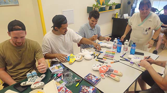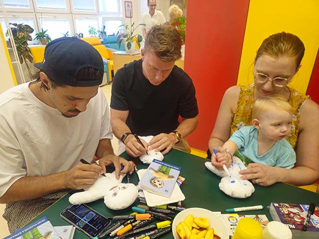 Hokejisté trénují i v létě, ale přesto si udělali čas potěšit malé pacienty a jejich maminky na dětském oddělení. Každý vybarvil panenku ve stylu svého klubu, kde hrají svůj životní hokejový sen. Nechyběly podepsané kartičky těch nejznámějších, nebo všemi přítomnými hokejisty podepsané knihy Boba a Bobka. Hokejisté nejsou jen sportovci, ale také tatínci, kteří mají vřelý vztah k dětem. Společné foto si na závěr návštěvy užily i děti.